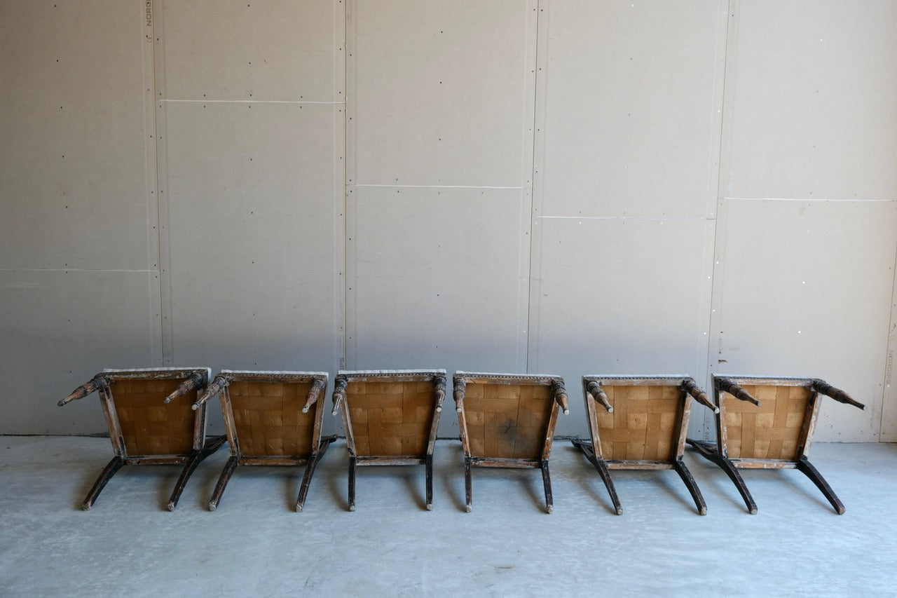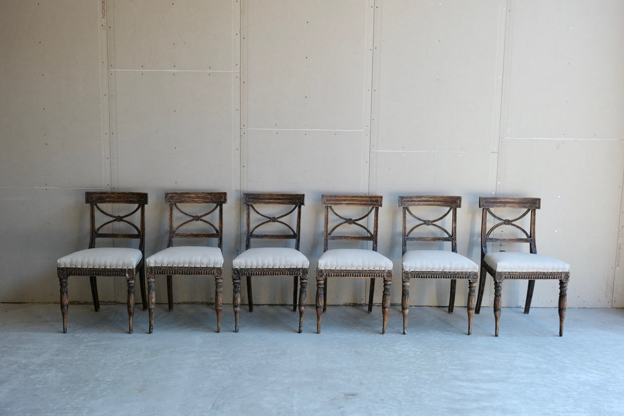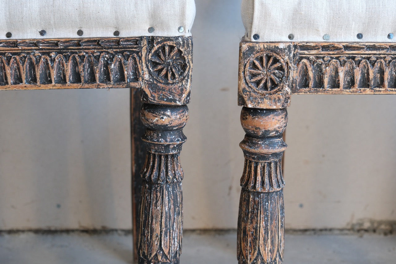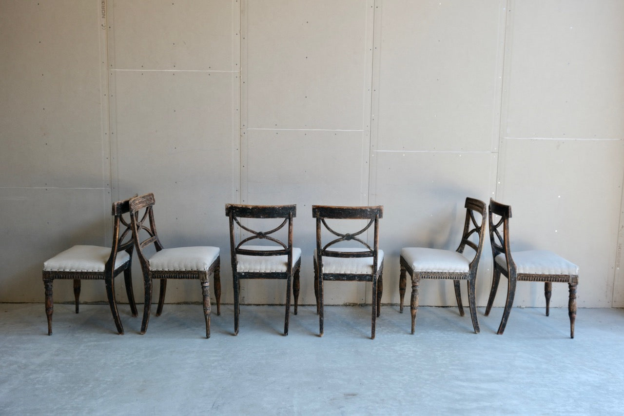 A set of period Gustavian chairs repainted in black and newly covered in linen. The model has always been called "Bellman chair" after the Swedish 18th century musician Michael Carl Bellman.