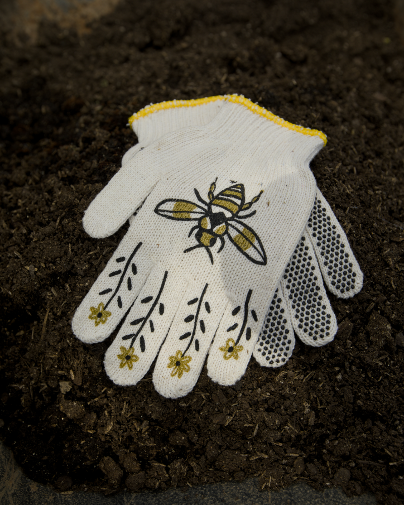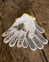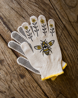 These hand screen-printed Bee gloves will make the gardening experience even more fun. On the front is a cute black and gold metallic bee with beautiful flowers reaching up each finger. On the other side is a dotted grip pattern to help grab with ease. Durable and made to last. Washable, one size fits most 70% cotton 30% polyester.