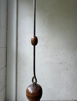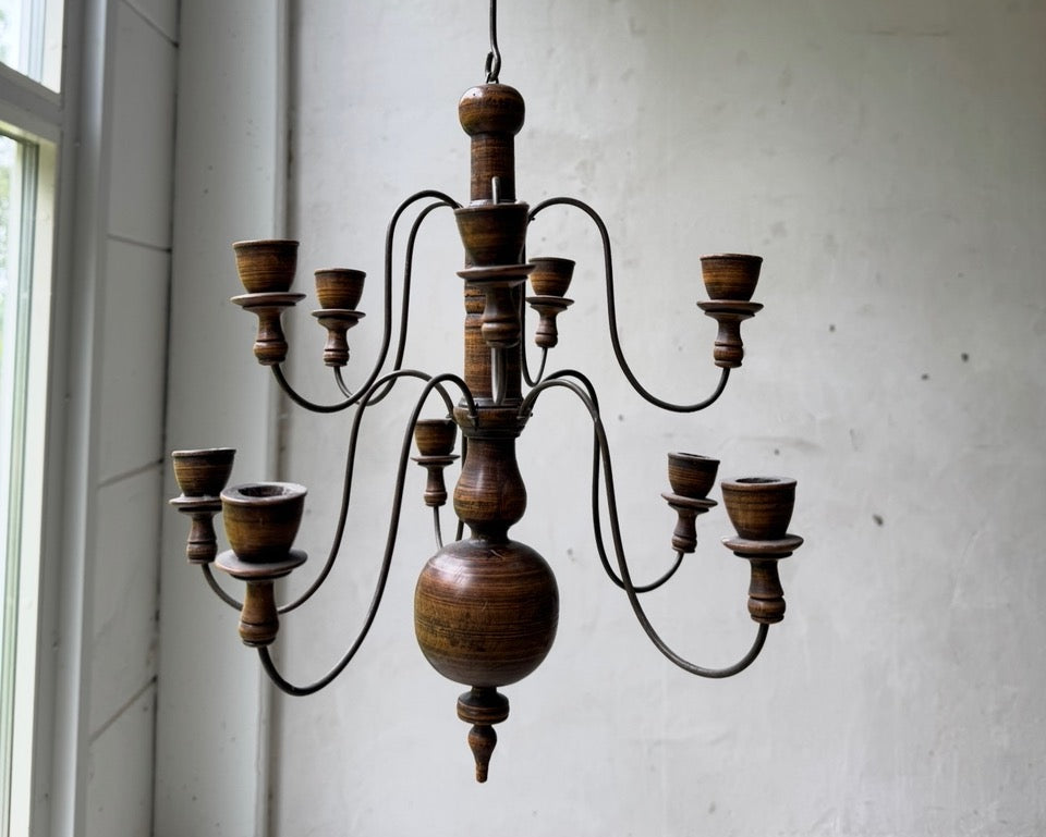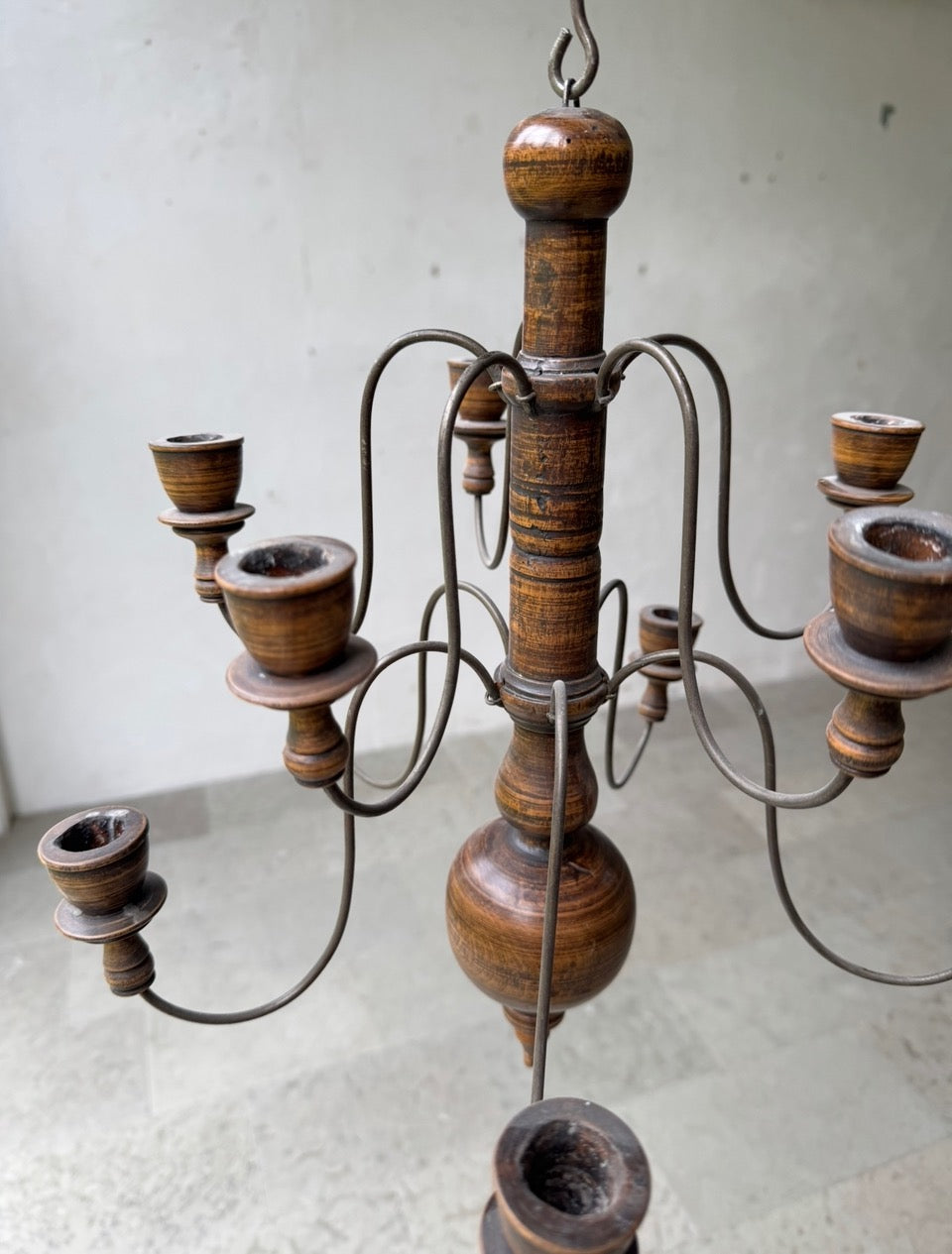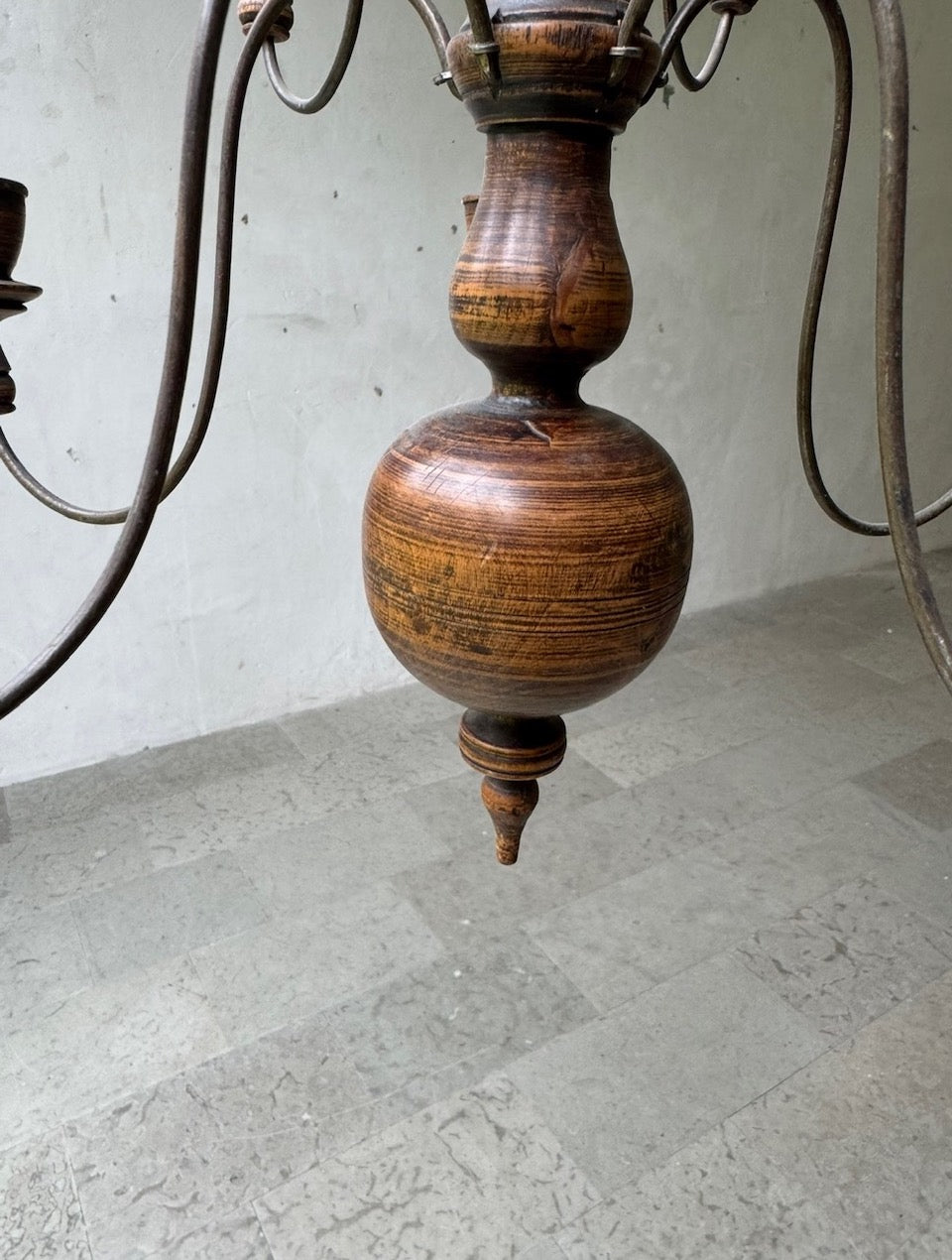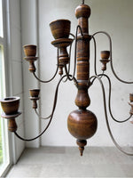 A mid 19th century folk art chandelier in iron and wood for 10 candles.