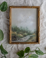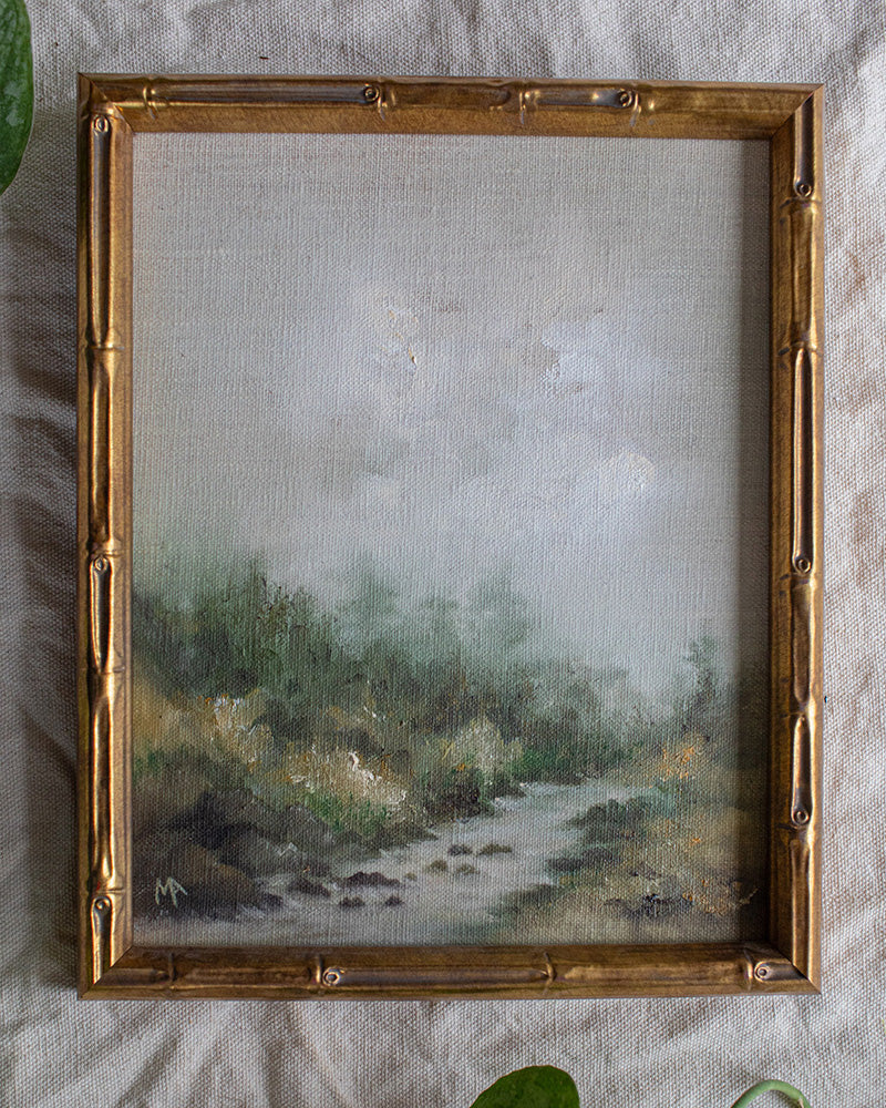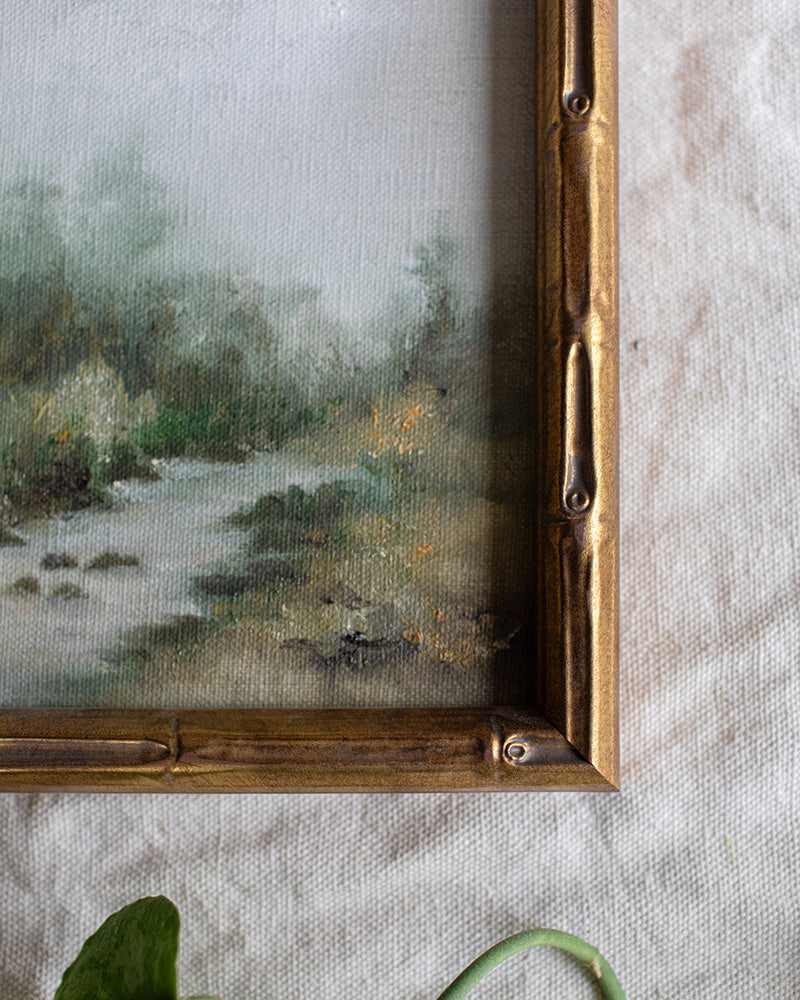 Painted with natural oil pigments on linen board in a vintage gold frame. Inspired by the misty lake at dusk at a nostalgia cabin from childhood.