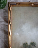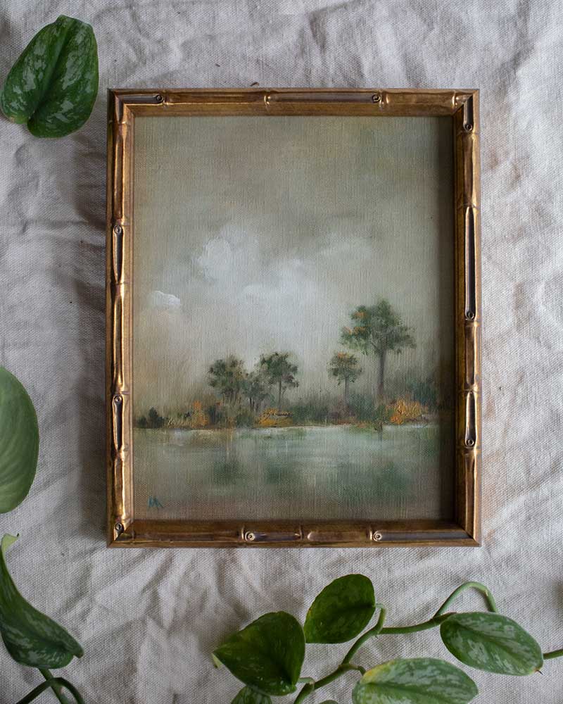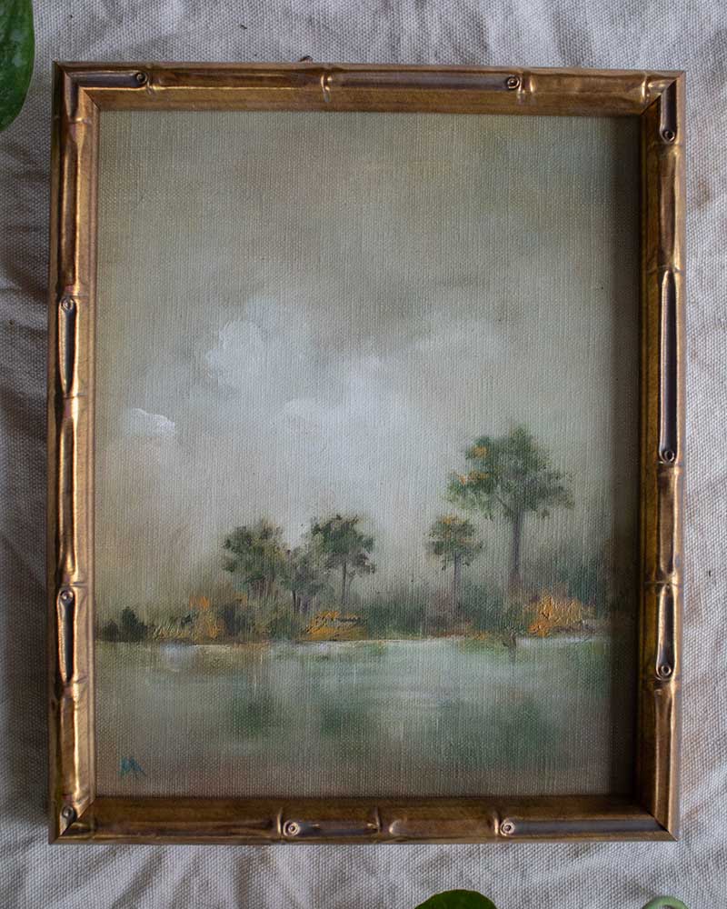 Painted with natural oil pigments on linen board in a vintage gold frame. Inspired by the misty lake at dusk at a nostalgia cabin from childhood.