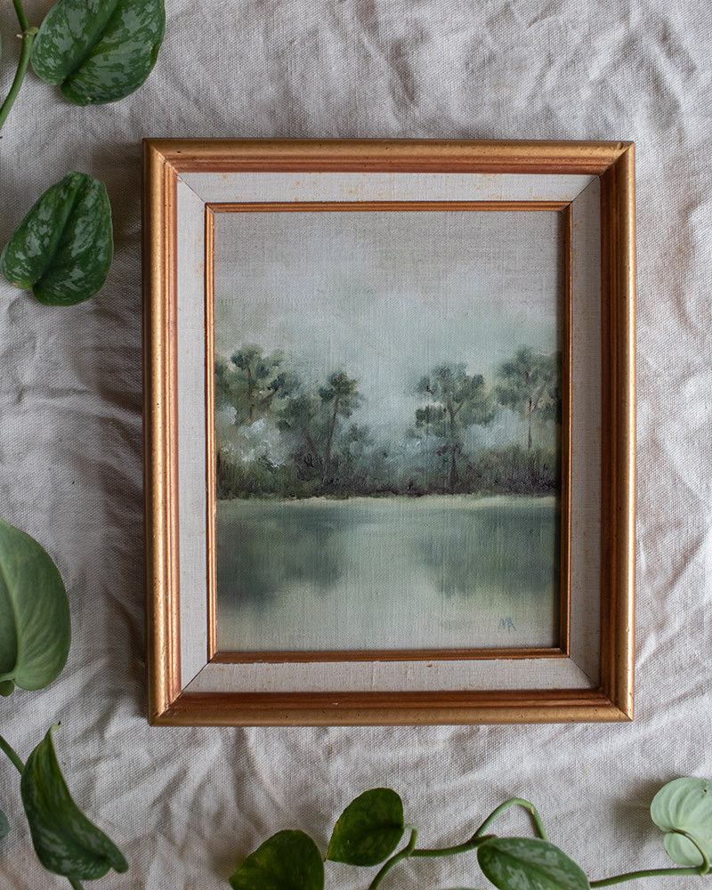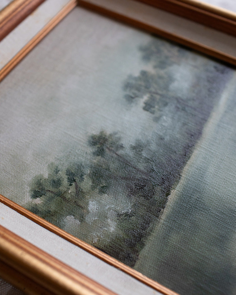 Painted with natural oil pigments on linen board in a vintage gold frame. This piece hangs beautifully with it’s sister piece “River View 1”.Inspired by the peacefulness of a still river. Can be displayed on a wall or on a shelf or mantle. Group pieces together for a more impactful presence.