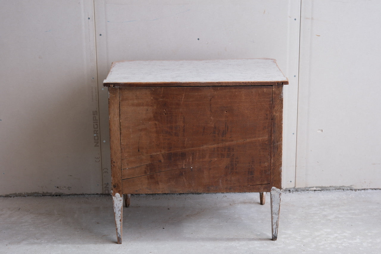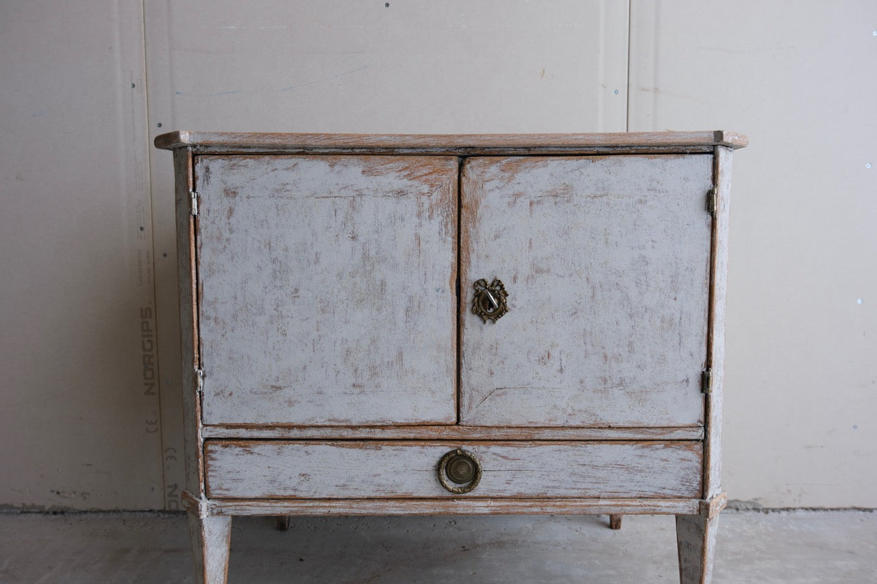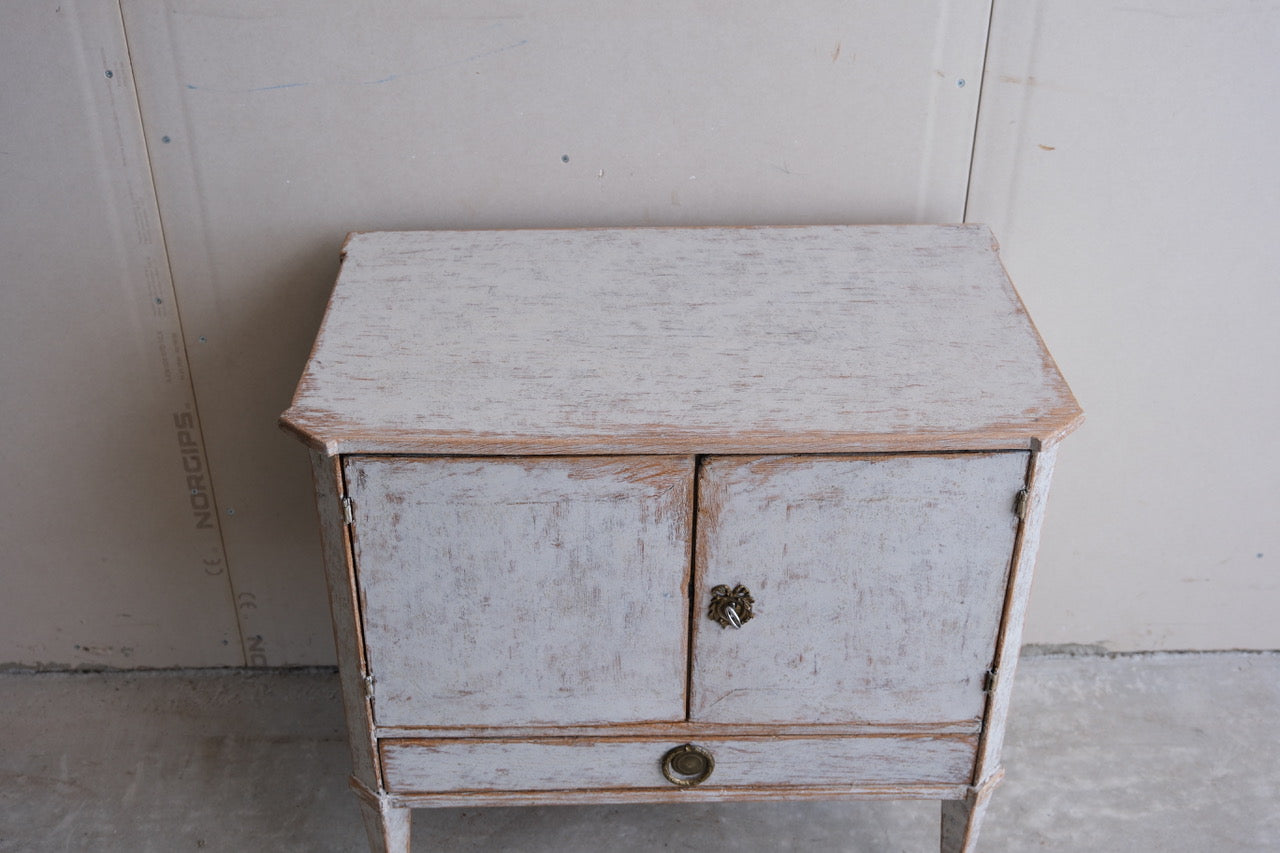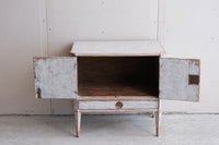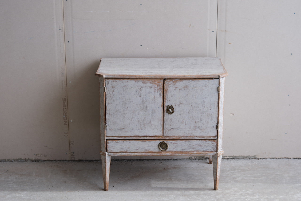 A period Gustavian nightstand with two doors and one drawer, repainted in soft grey. manufactured c1790