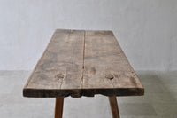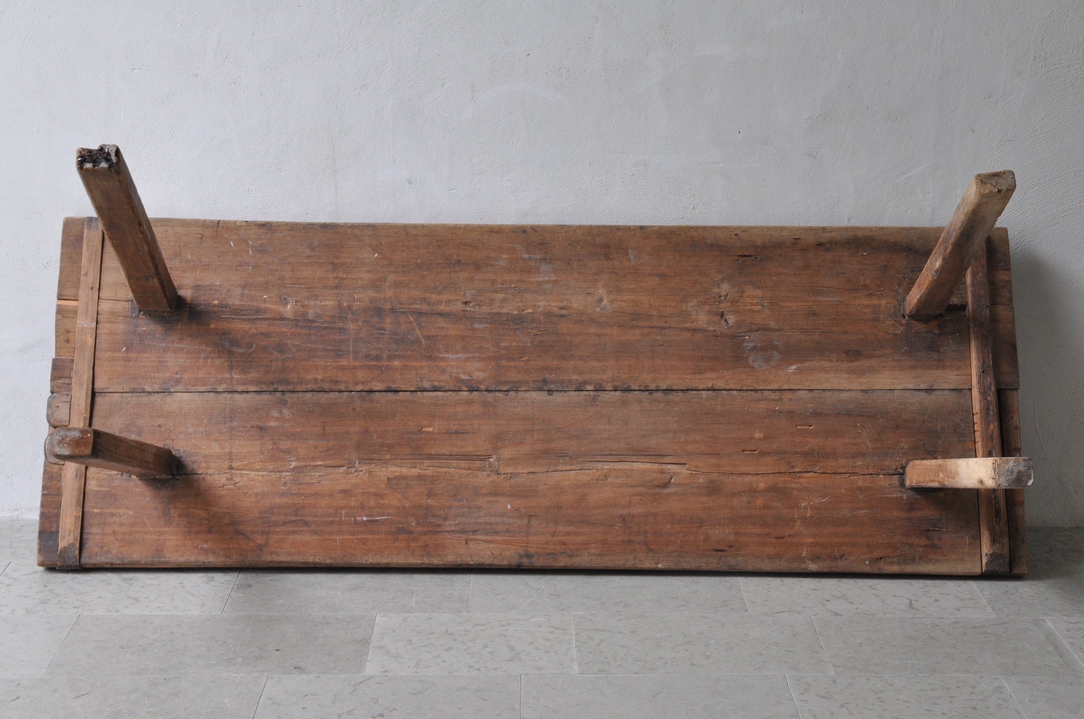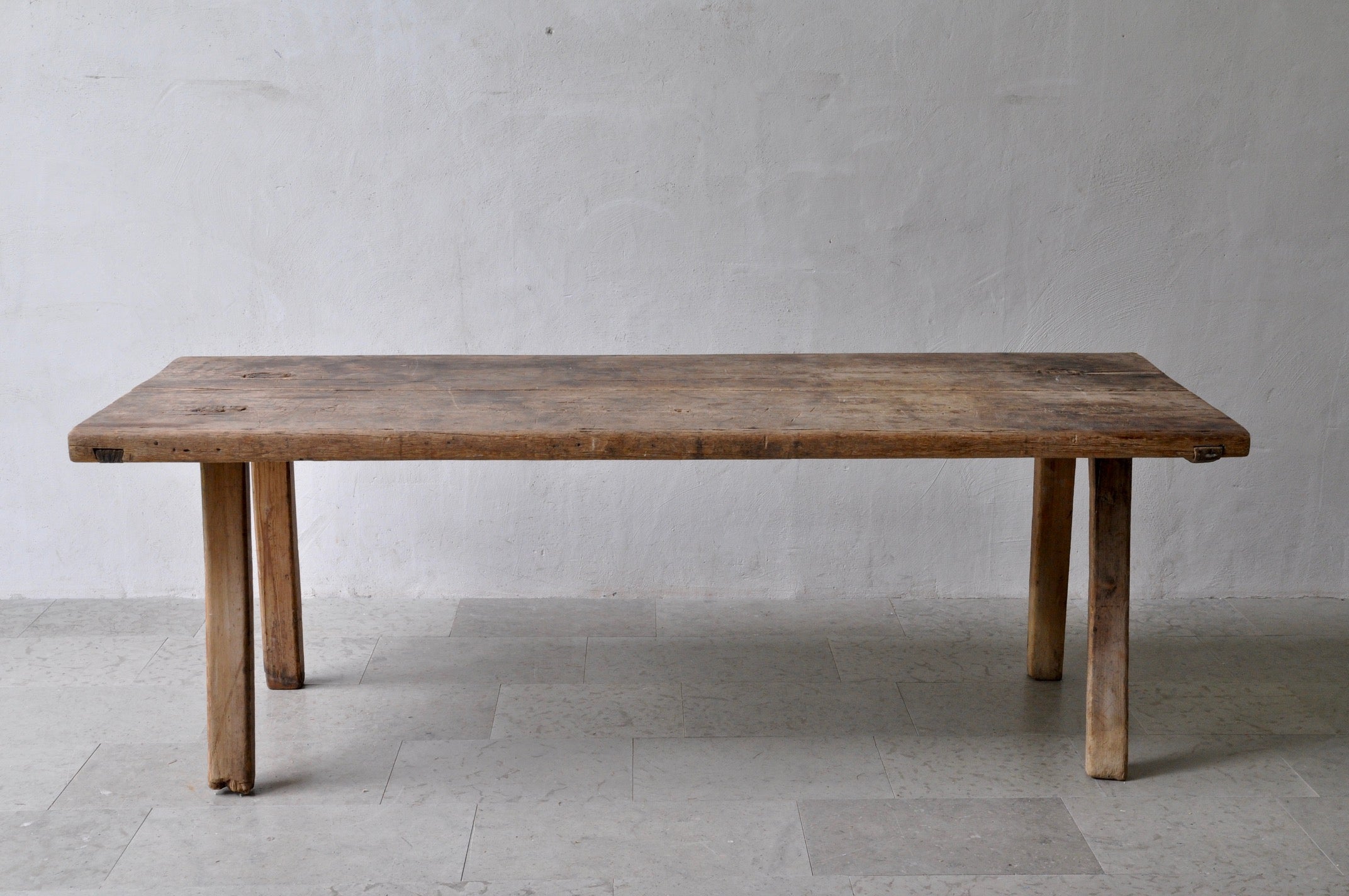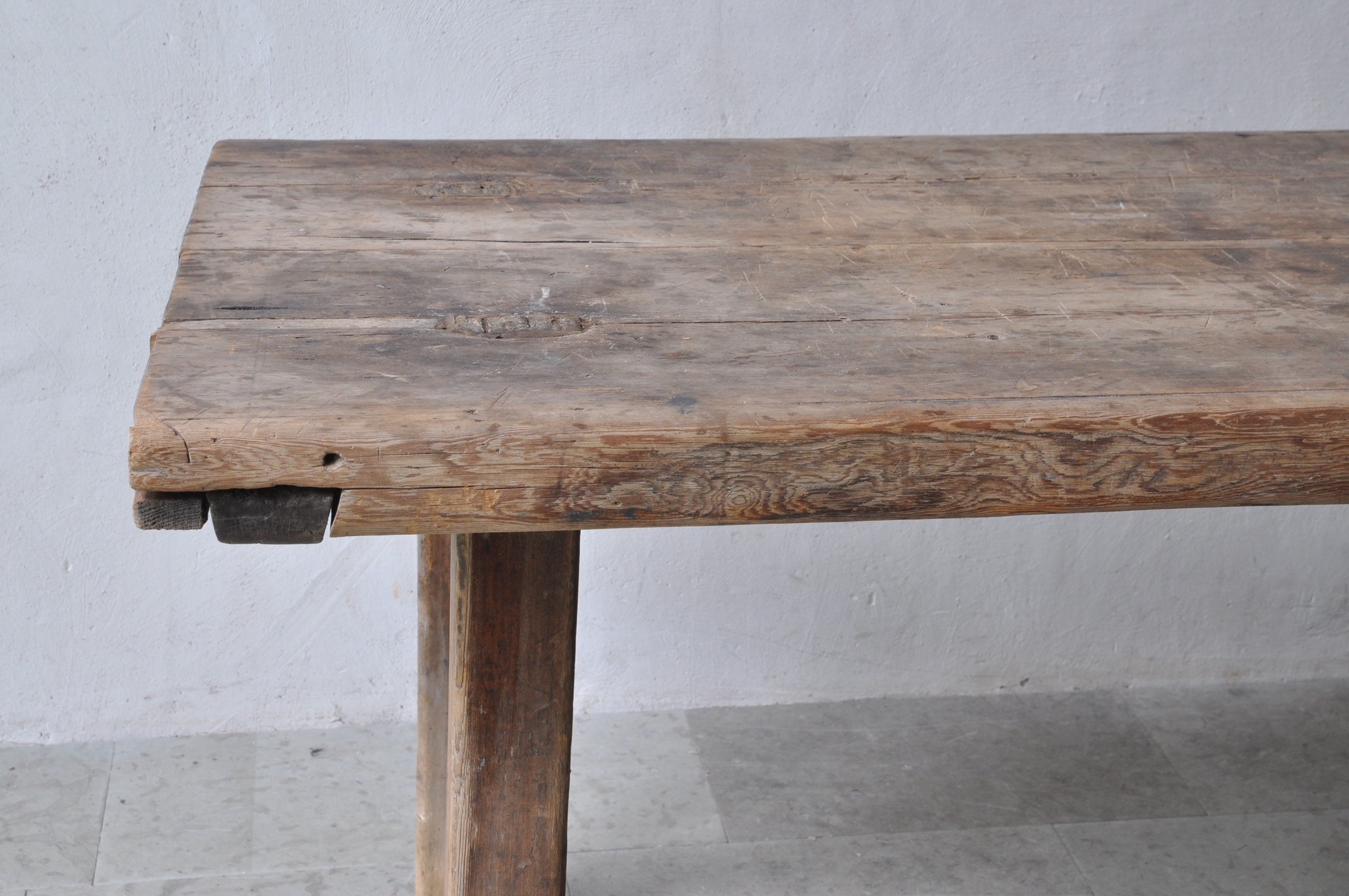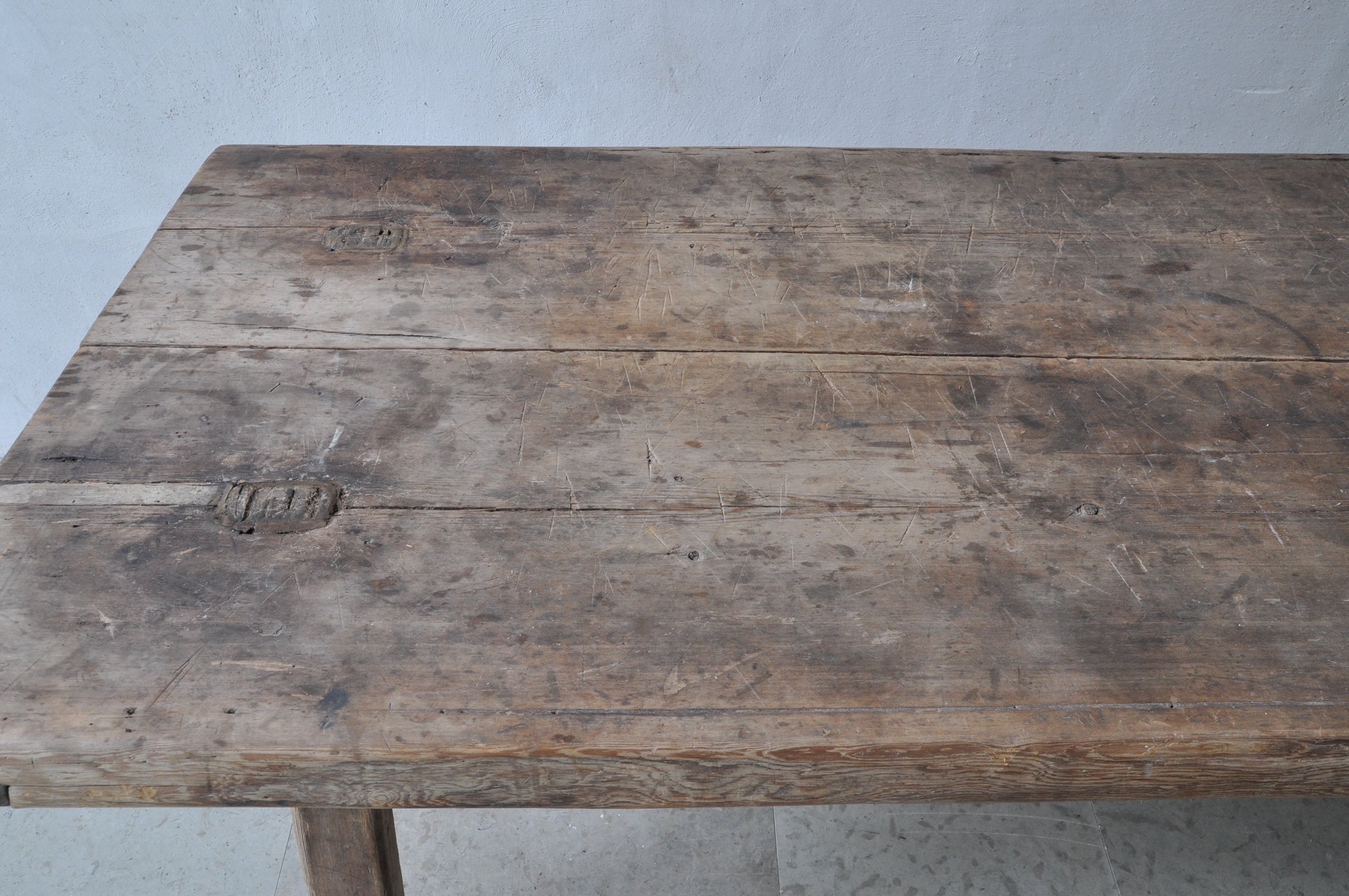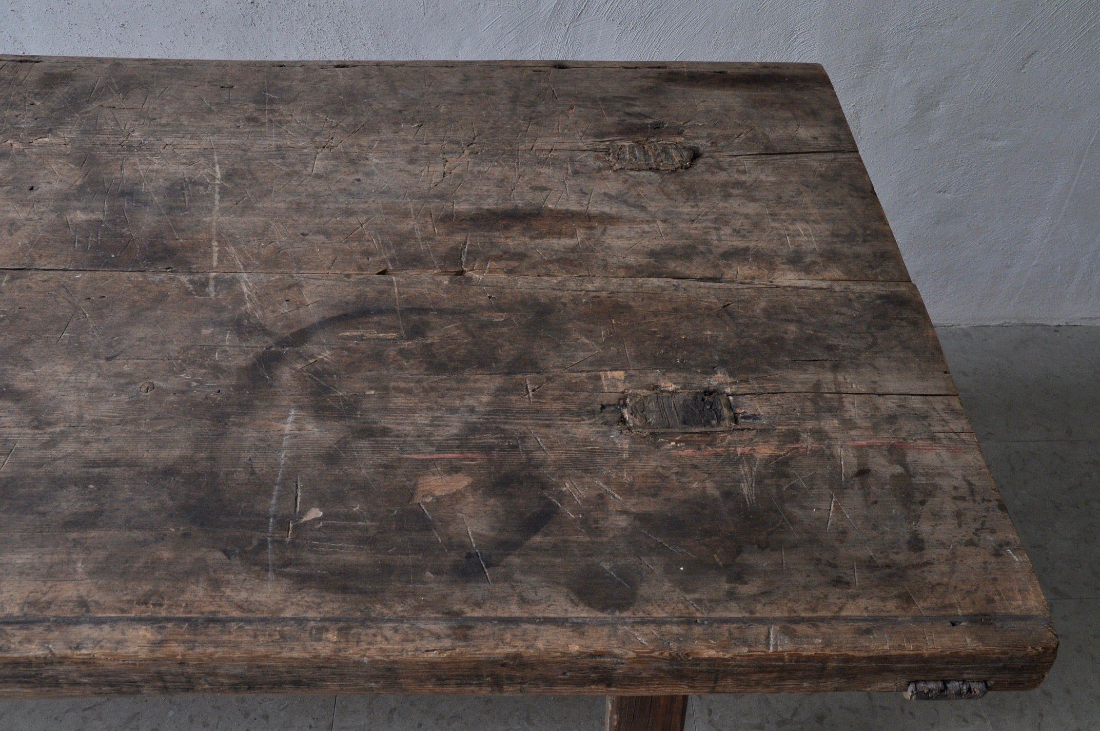 An 18th century primitive pine table from Dalarna, so called Hednabord. Table to is 2.25". thick.
