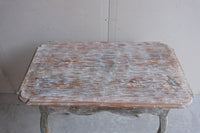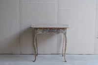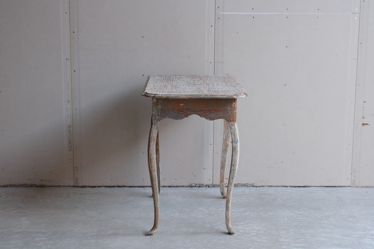 A period rococo table with one drawer. Scraped to traces of original blue paint.