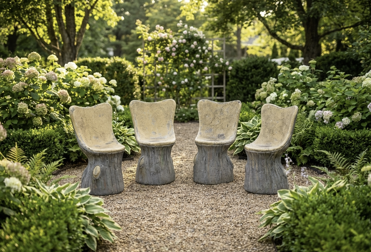 English vintage cement faux bois chairs.